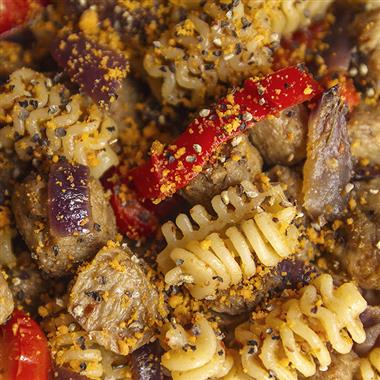 ריגטוני עם טחון טבעוני וקישואים בבהרט