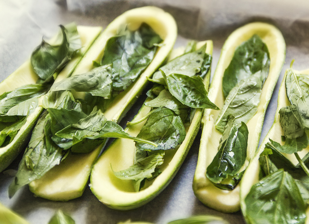 3. מרוקנים אל קערה את "בשר" הקישואים. הדרך הנוחה ביותר לעשות זאת היא באמצעות כפית. מחזיקים את הקישוא ביד אחת ועם הכפית "מגרדים" את בשר הקישואים החוצה, עד לקבלת סירות קישואים. את הסירות מסדרים על תבנית אפייה, מרפדים בהמון בזיליקום טרי ומניחים בצד.