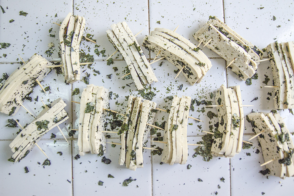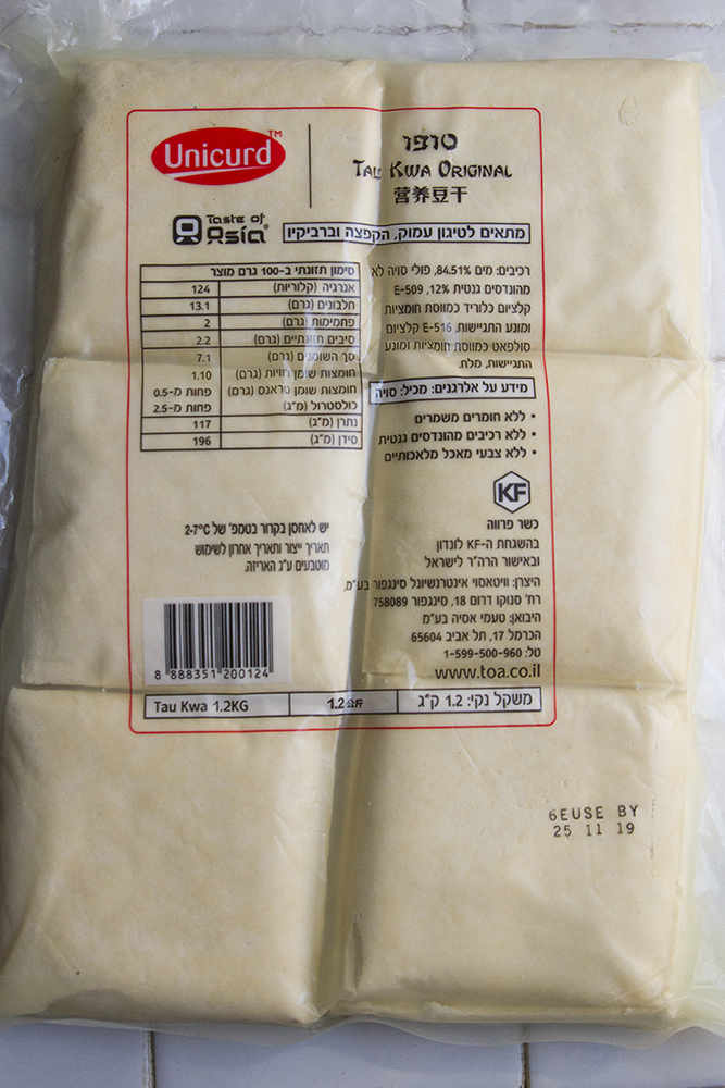 2. פורסים את הטופו לפרוסות דקות, בעובי של כ-2 מ"מ לפרוסה.