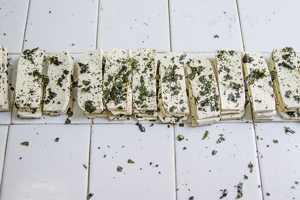 4. ג'ולס עושה את כל הסעיף הזה כאן כשהטופו עדיין מונח על המגבת, אבל אני לא רואה סיבה להיתקע עם מגבת שמסריחה כמו דג, לכן, פשוט מנקים היטב את משטח העבודה וחוסכים את הבלאגן. על משטח העבודה מניחים את כל פרוסות הטופו הסחוטות מנוזלים.