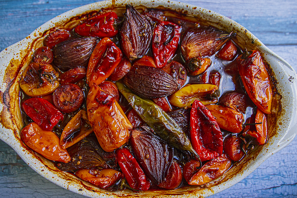 12. מעל הסטייקים מסדרים את פלחי הבצל, פרוסות הגזר, הפלפלונים המתוקים (והחריפים, אם זרמתם איתי...)